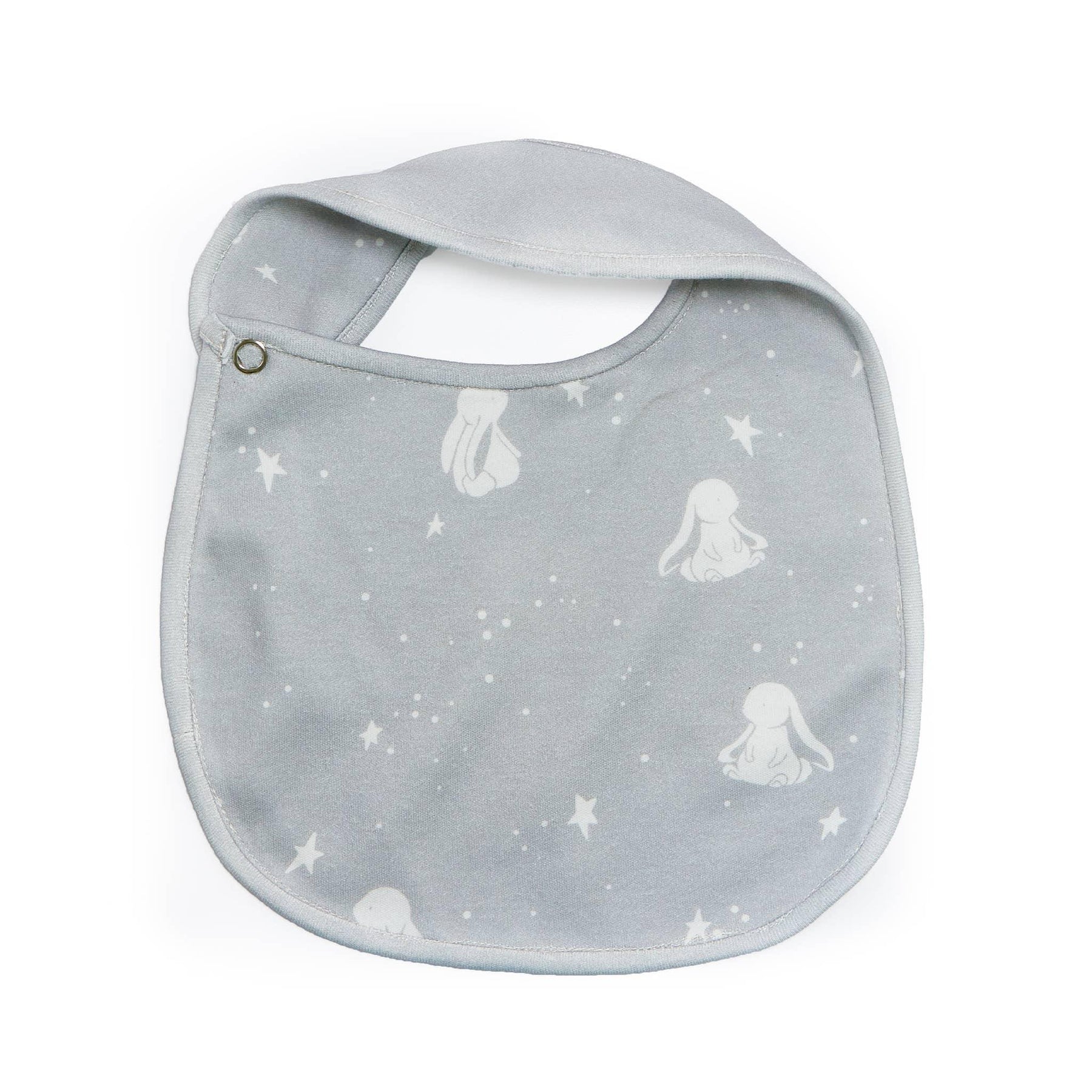 Darling Glacier Gray with White Bloom Bunny Pattern Keep baby clean and dry with this organic cotton baby bib. Super soft fabric for wiping baby’s sensitive skin. Snap closure for easily putting on and taking off even the wiggliest of babies.