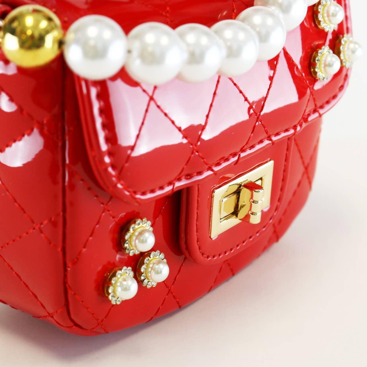 This vibrant red patent leather handbag sparkles with charm thanks to its quilted design and pearl-accented handle. A playful favorite and Ridge Kids bestseller, it’s the perfect pop of fun to brighten any outfit while keeping essentials close in style.