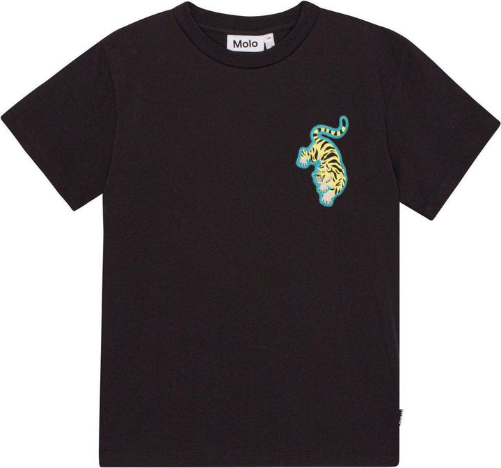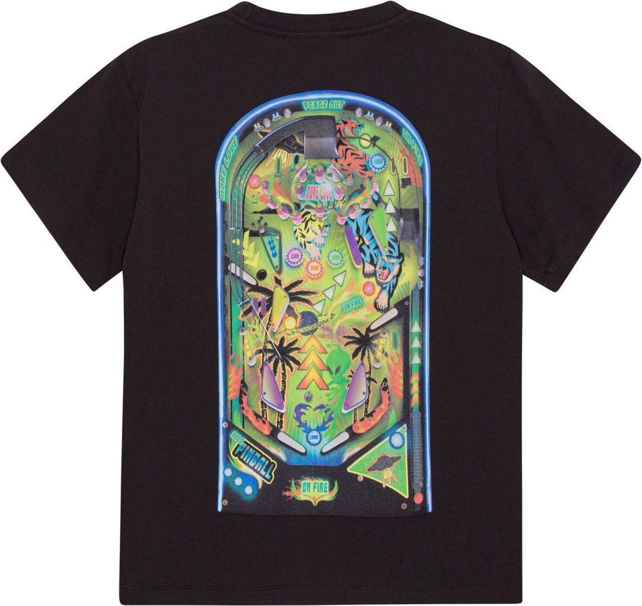 Riley Pinball Dark T-Shirt by Molo is 100% organic cotton, GOTS Organic certified. Find the tiger that escaped the pinball game on the front, while the back features a wild design with tigers, aliens, palm trees, and flames. Can you find the ball? Loose fit and ribbed edges make for a comfortable, playful look.