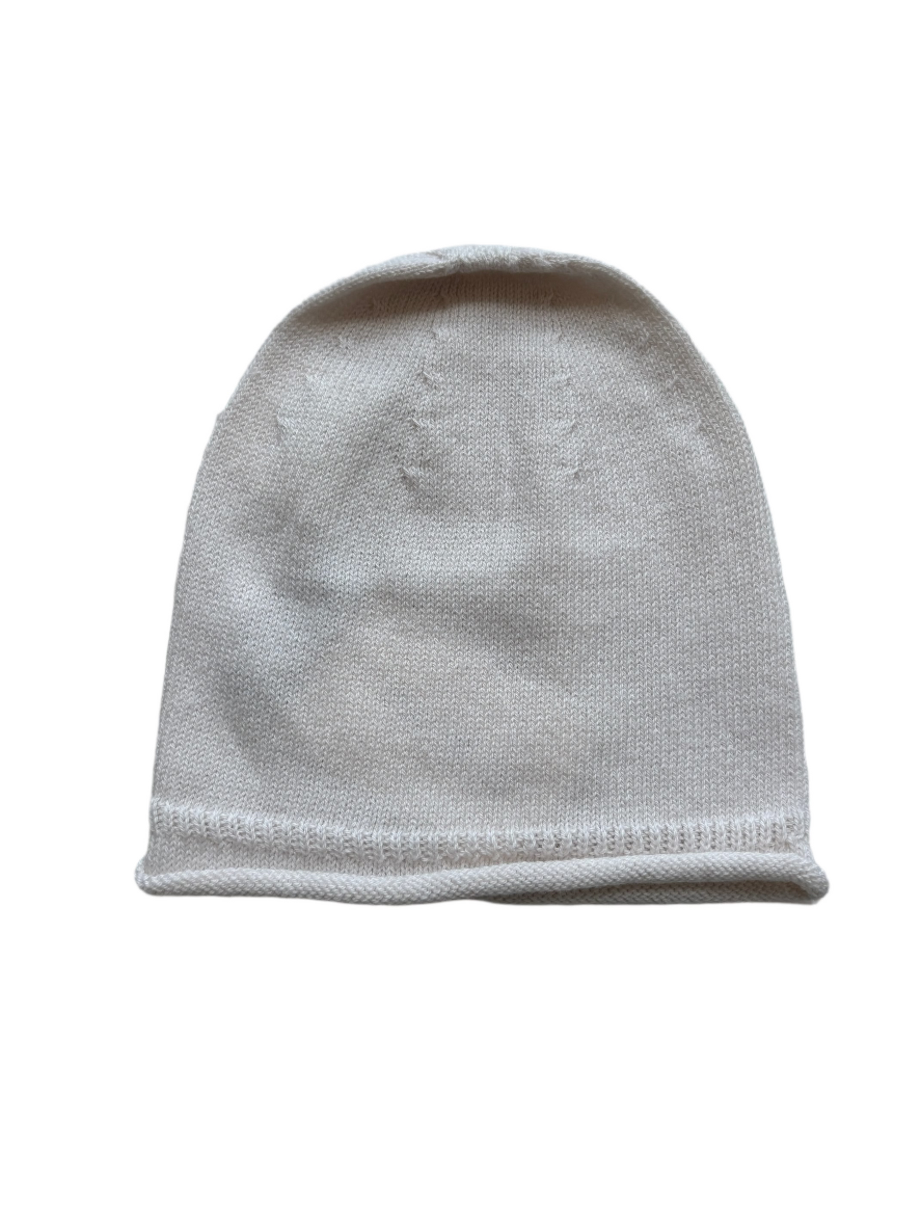 Keep your little one cozy with this charming cream knit hat, handmade in Spain from soft cotton. Perfect for chilly days, it’s a cold weather essential that combines comfort and heirloom quality. Snuggle up in style and warmth with this timeless piece designed to last through all your baby’s adventures.
