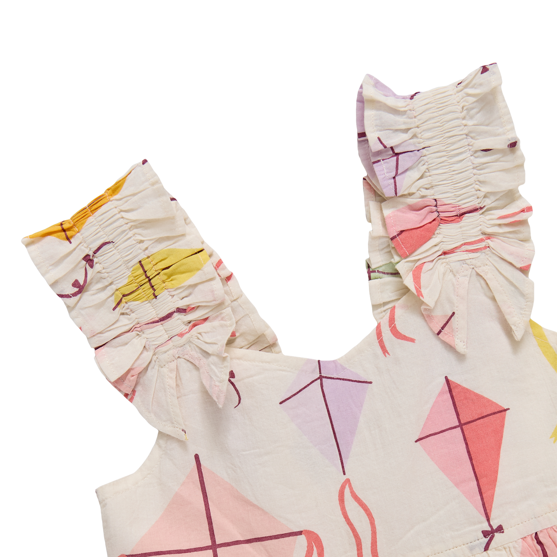 A joyful print designed for bright spring days! The Via Dress in Flying Kites features softly ruched sleeves and adjustable straps that can be worn straight or crossed in the back for a customizable fit. Lightweight cotton cambric keeps the silhouette breathable and easy to wear. Finished with silver glitter buttons, this playful piece is made for twirling through sunny afternoons.