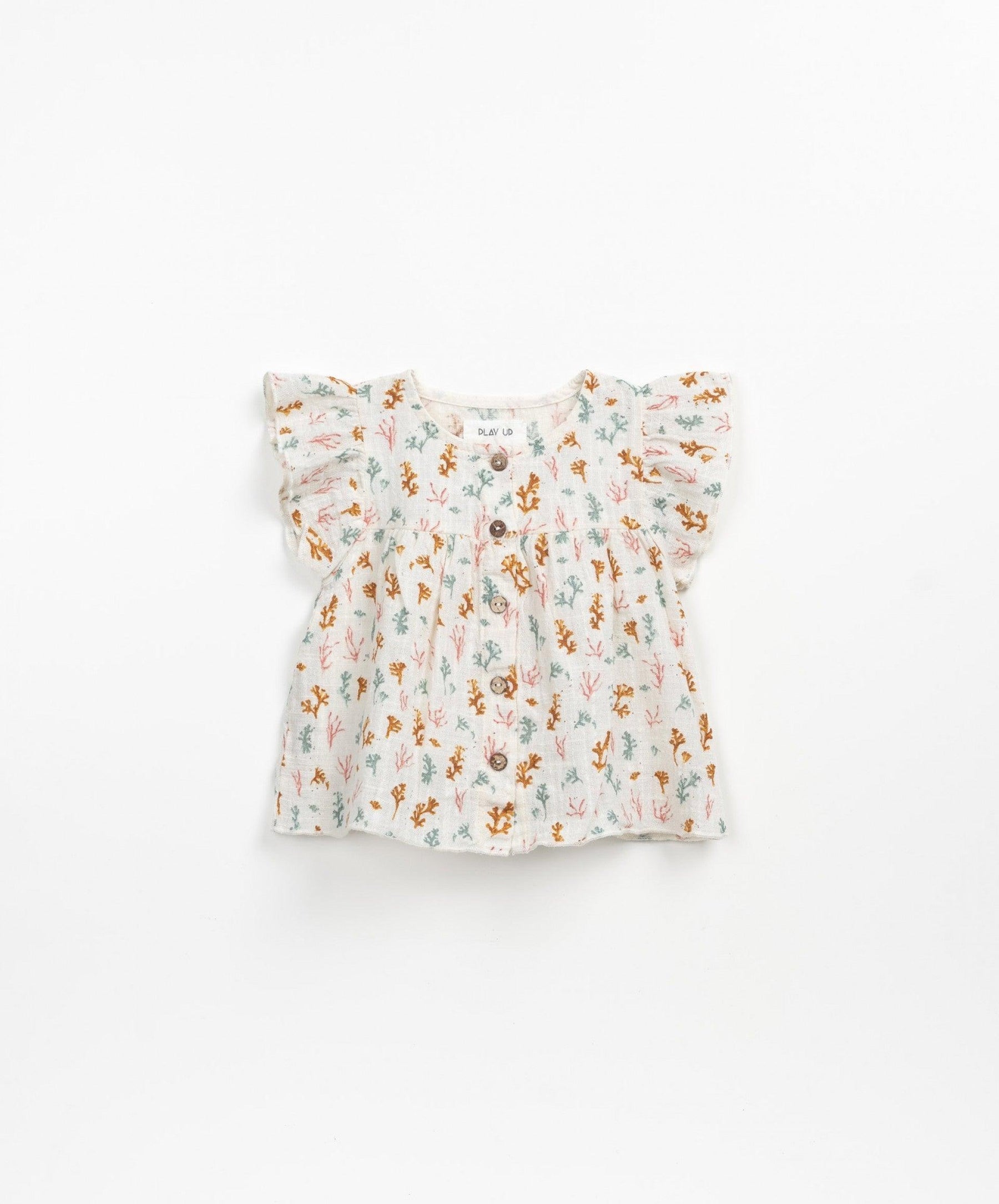 - The model has a round neck, fringed sleeves, a front opening with coconut buttons and our seaweed print.
