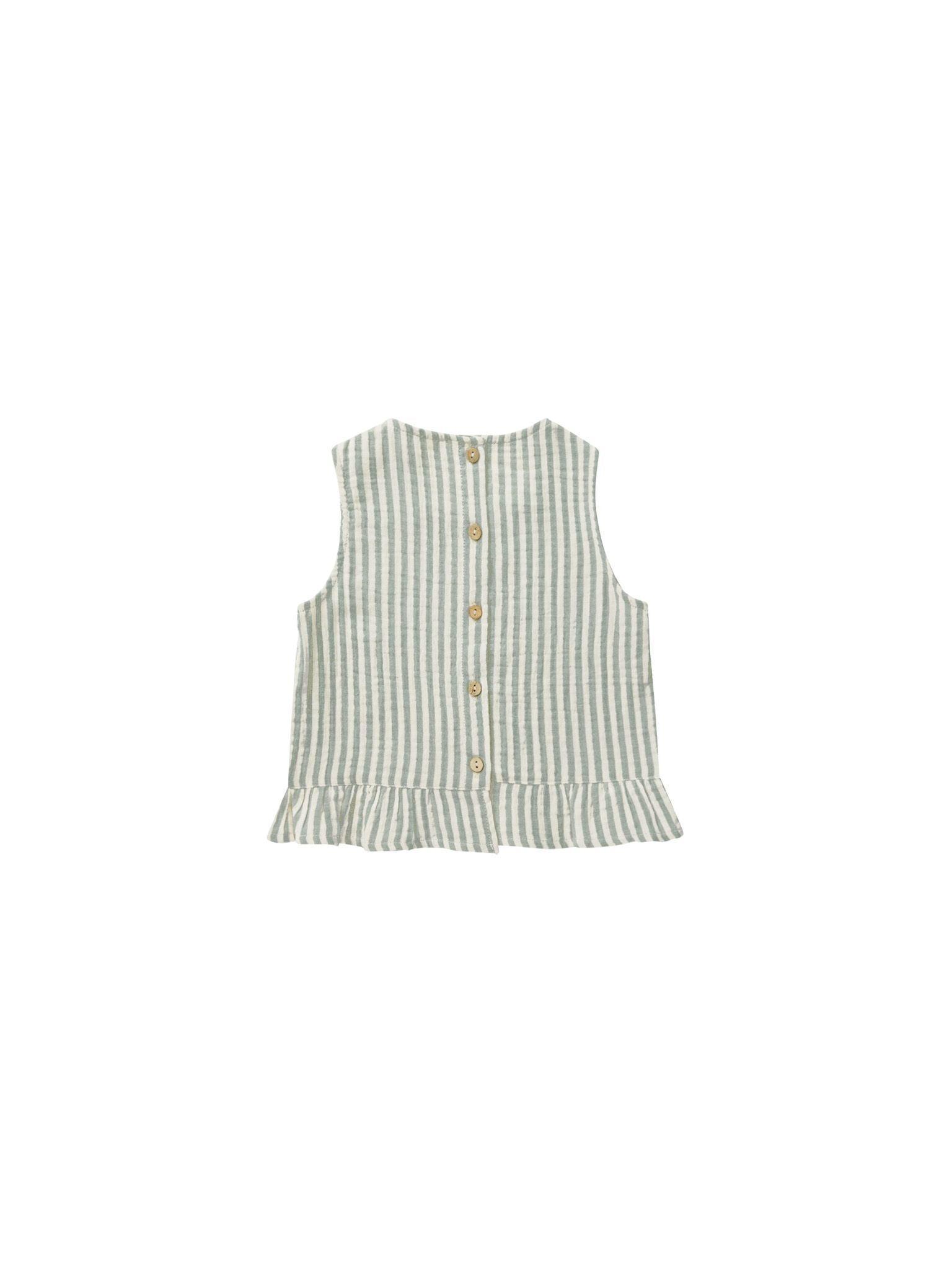 This sweet sleeveless woven cotton top has buttons down the back and ruffles along the bottom for playful detail.