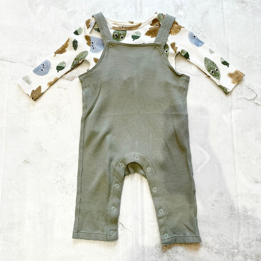 This set is the cutest set for Fall, a deliciously soft thermal and sage green overalls -- perfect for all the apple picking and pumpkin spiced treats headed baby's way!