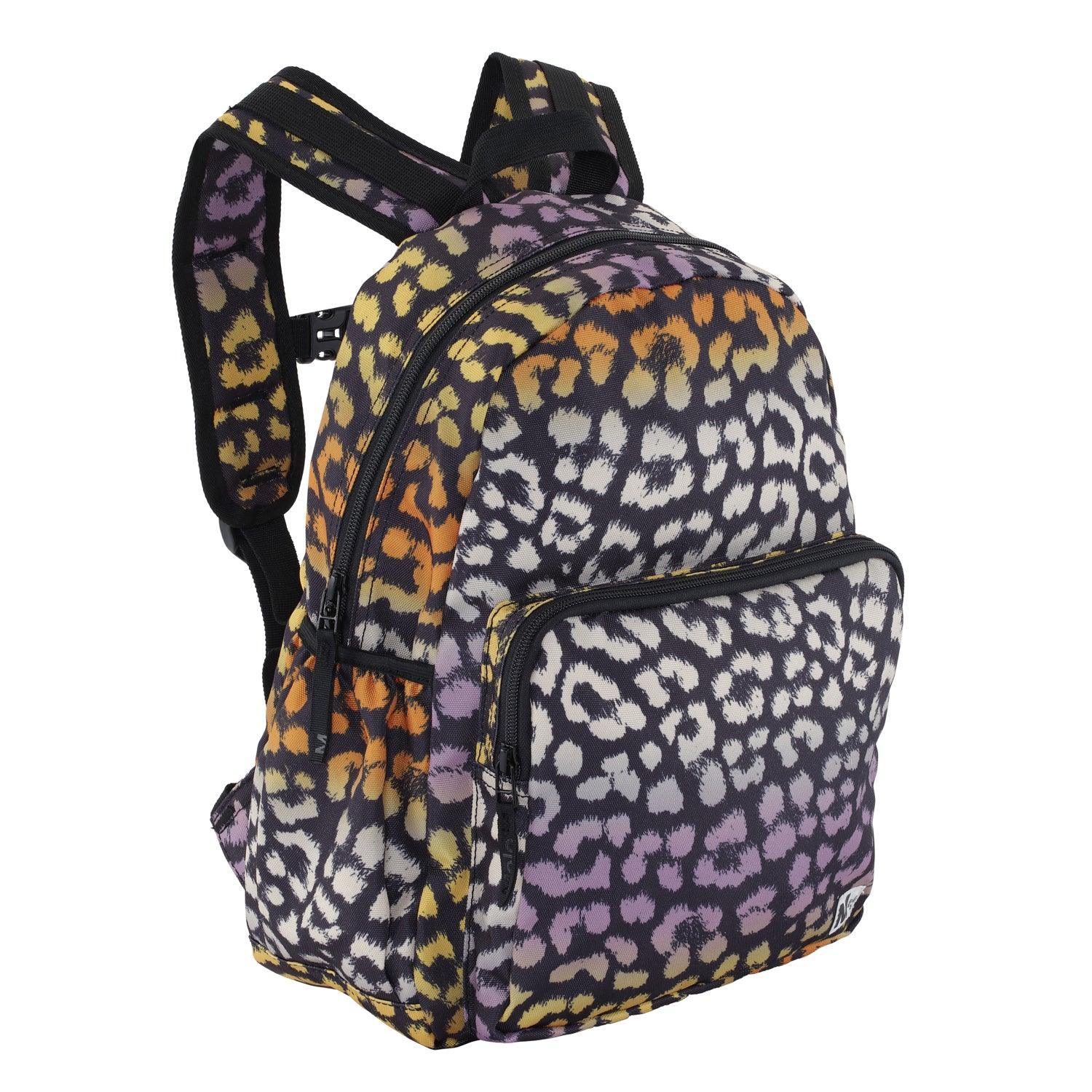 Roomy rucksack in various coloured leopard print. It is constructed in fabric made from recycled polyester. It has an exterior front pocket with a zipper and pockets at both sides for, e.g., a bottle of water. The rucksack has a padded back, a loop, adjustable straps. and an inner pocket.