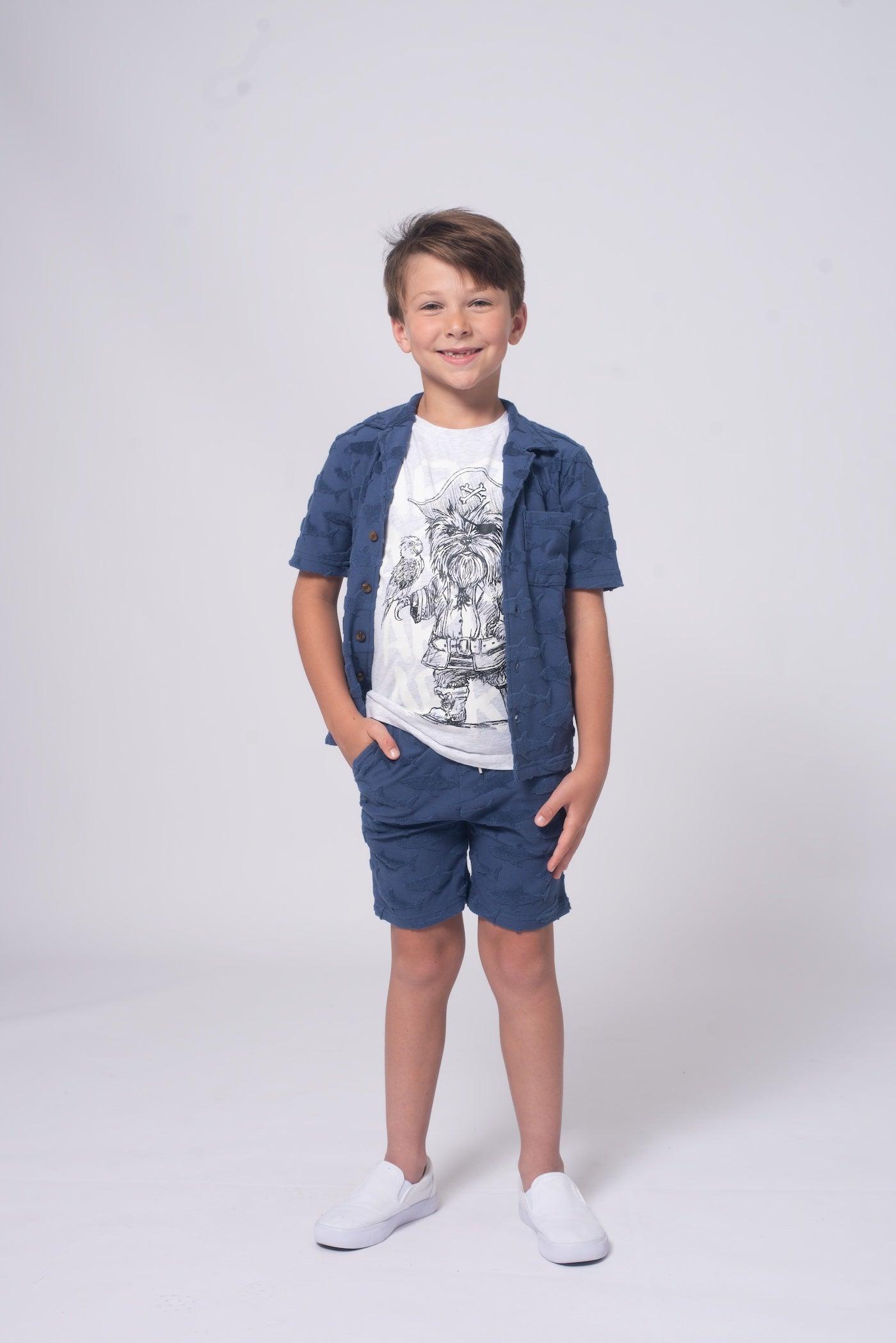 Dive into cool style with our boys' navy shark resort shirt from Appaman! Made with lightweight, breathable fabric, this top is perfect for beach days or casual outings. Its all-over shark print and relaxed fit make it perfect for vacations or everyday wear. Complete the set with the matching shorts!