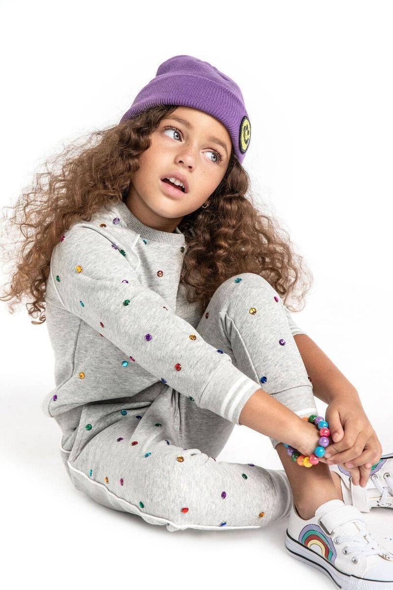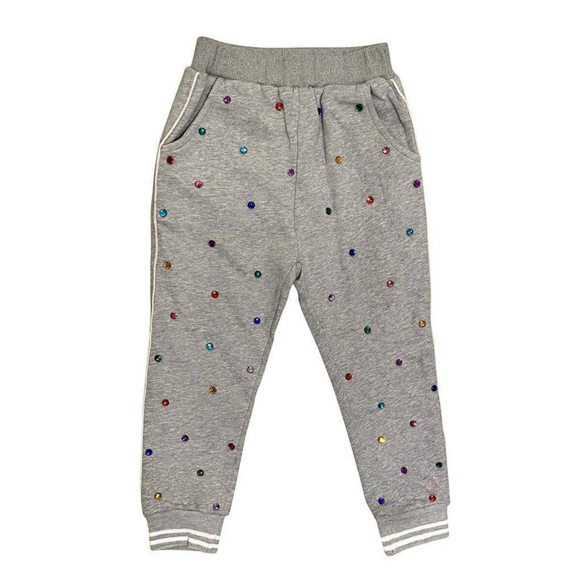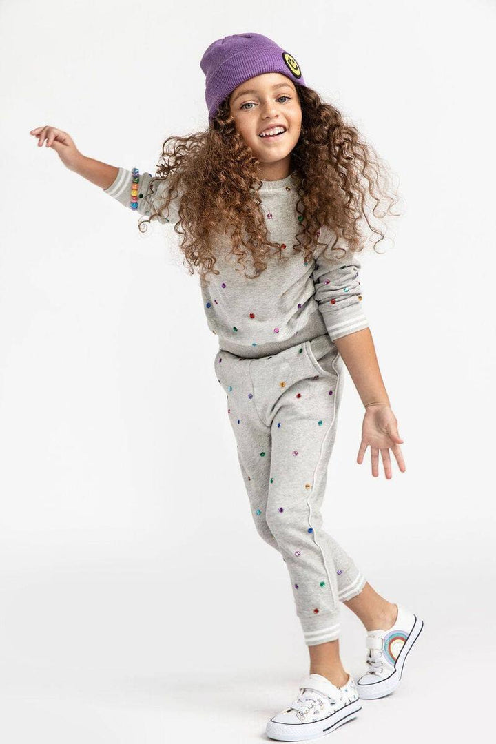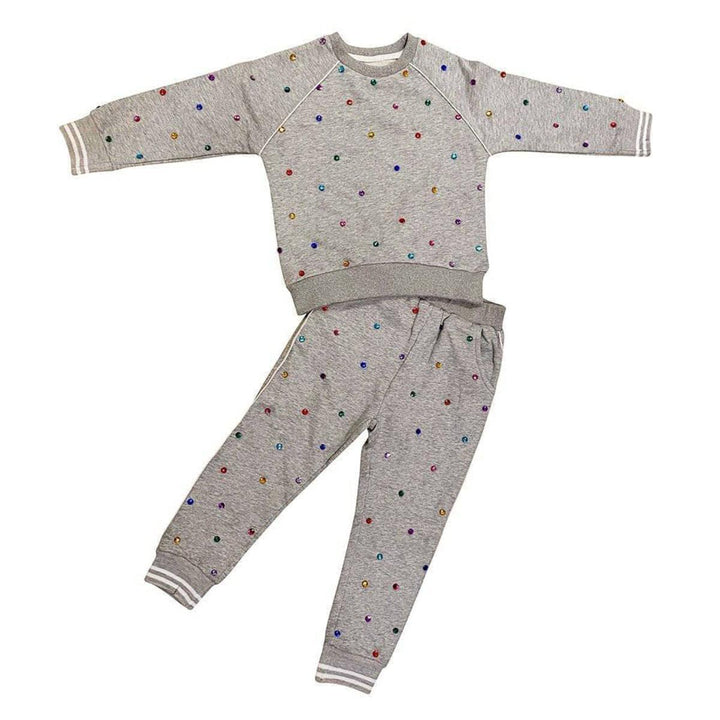 Get your girl the perfect lazy-day look with this stylish Rainbow Gem Trackset! Featuring a comfy grey matching set covered in rainbow gems, it's lightweight and perfect for all seasons - just throw on the soft fleece and she'll have an easy go-to outfit! Give her the luxury of loungewear and watch her shine bright like a diamond. (Models wearing a size 8!)