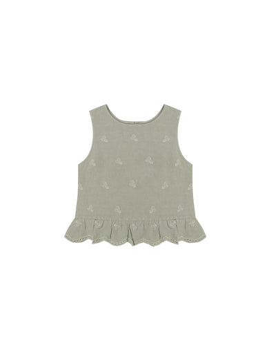 This sleeveless cropped top features a ruffle with open button back to keep her cool and stylish.