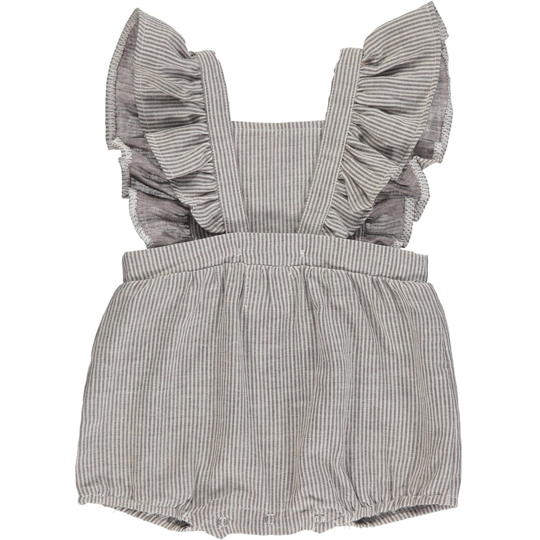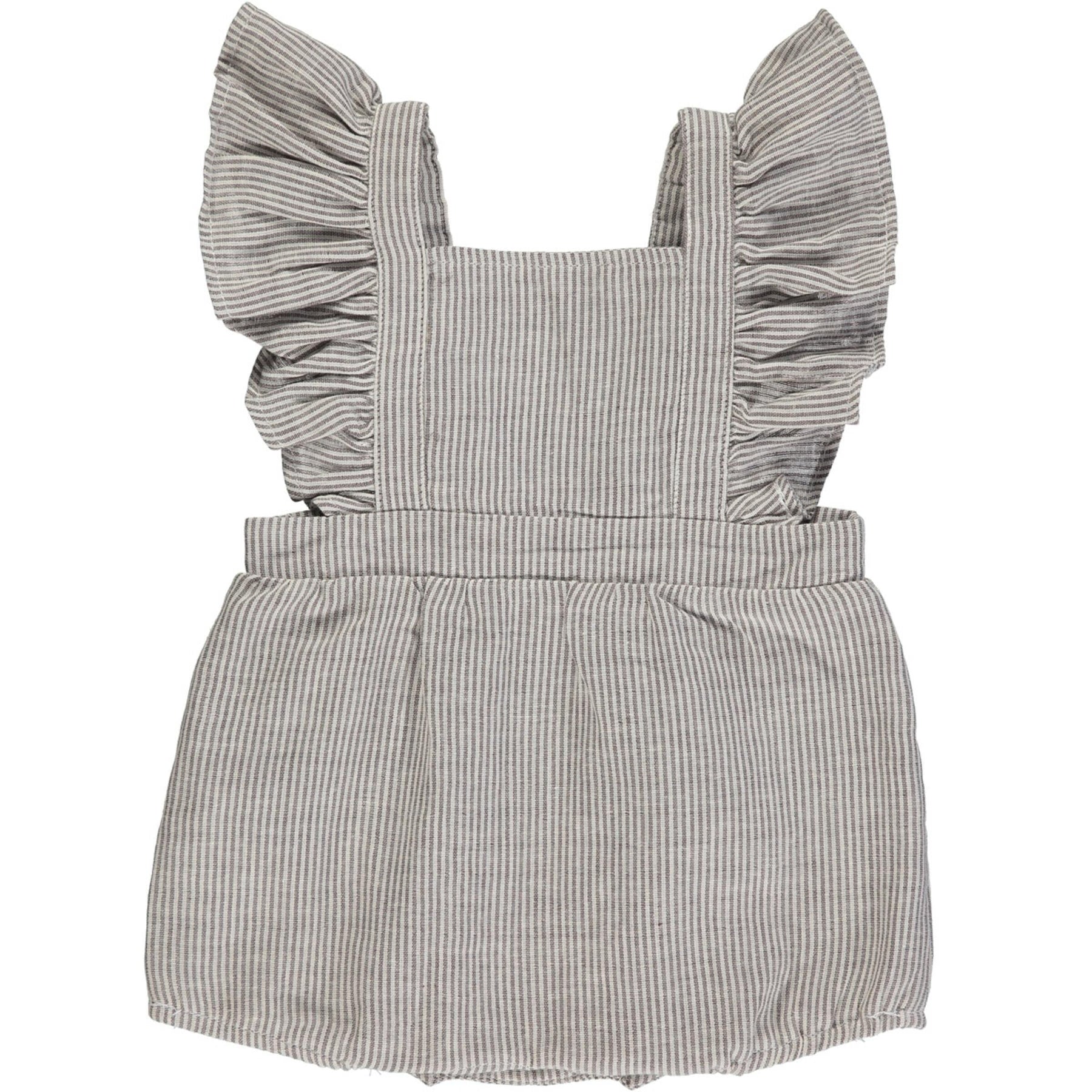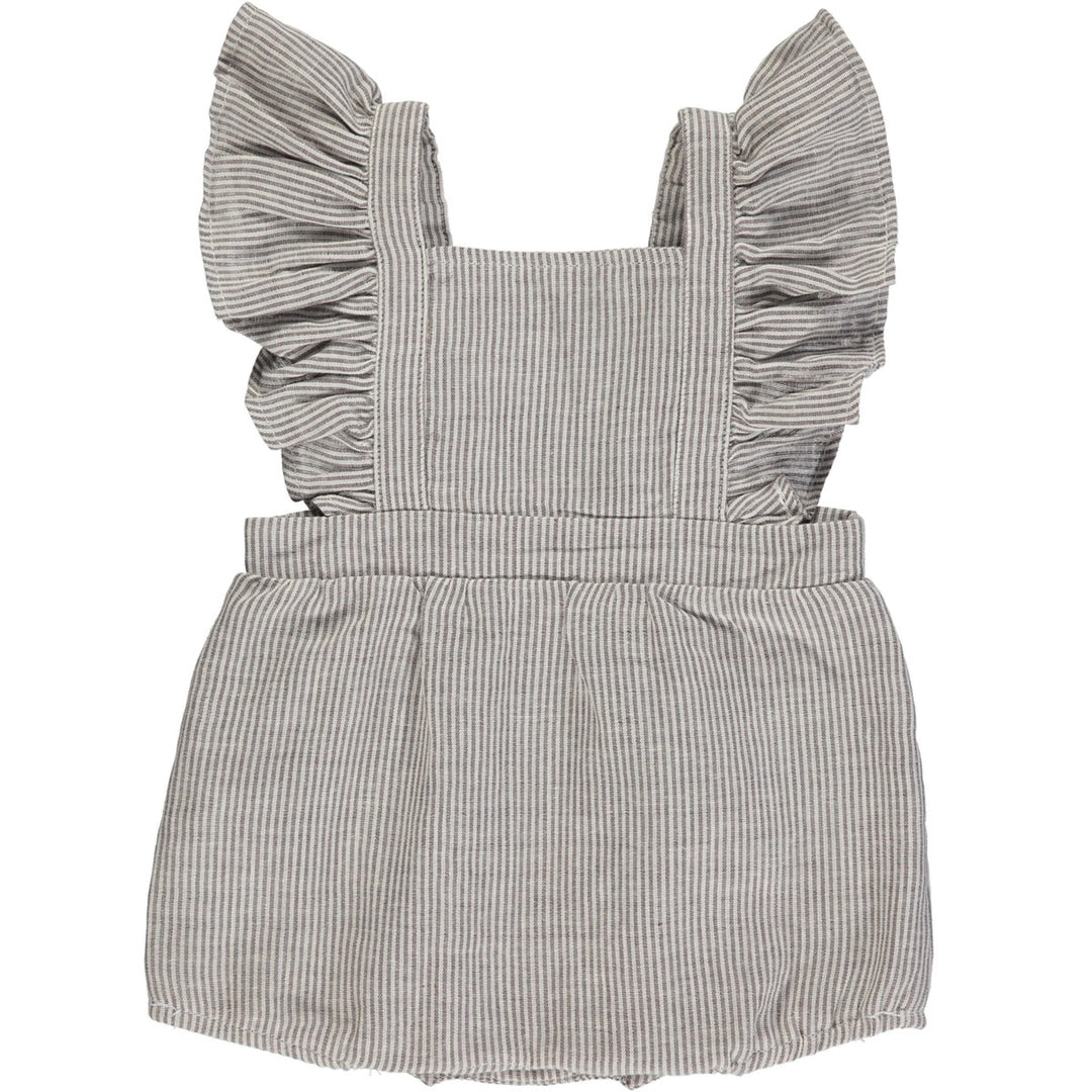 Adorable Baby Romper in Charcoal Stripe from Vignette. Looks great worn on its own and layered with onesie underneath.