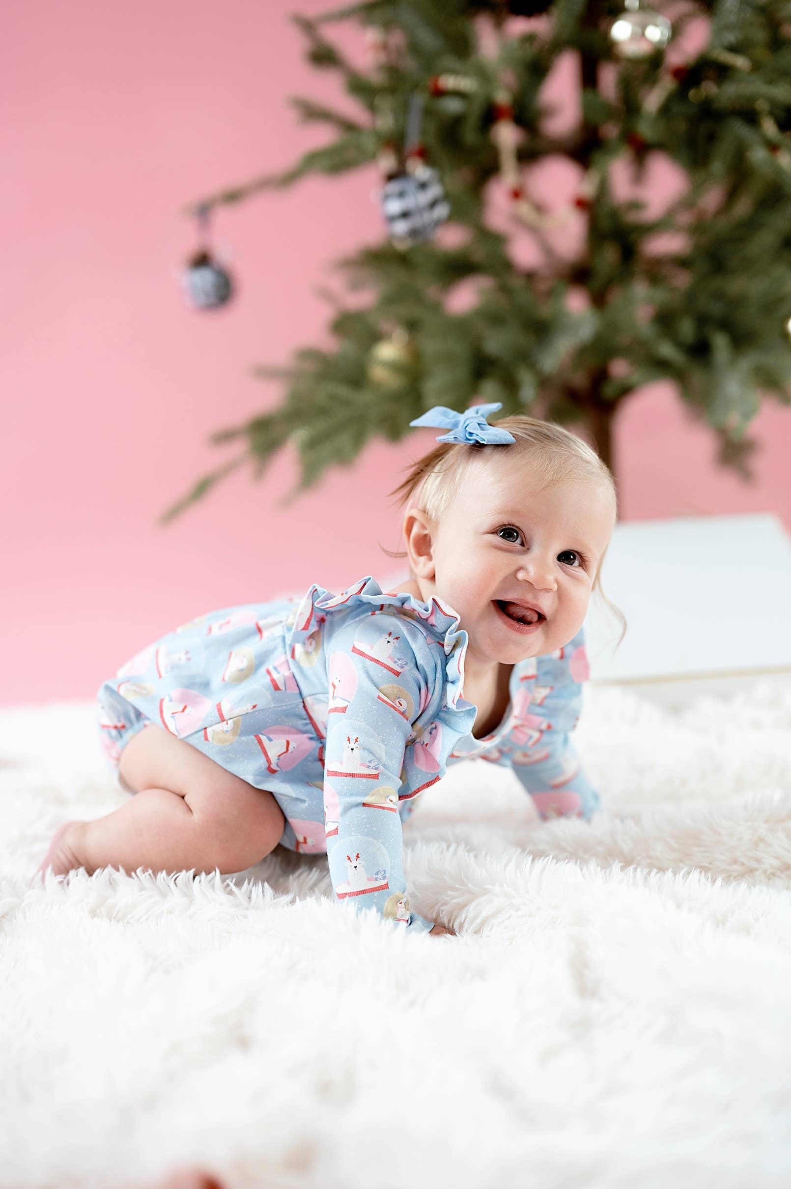 •  Ruffled detail in front and back, long sleeves and a 3 snap closure for easy diaper changes.