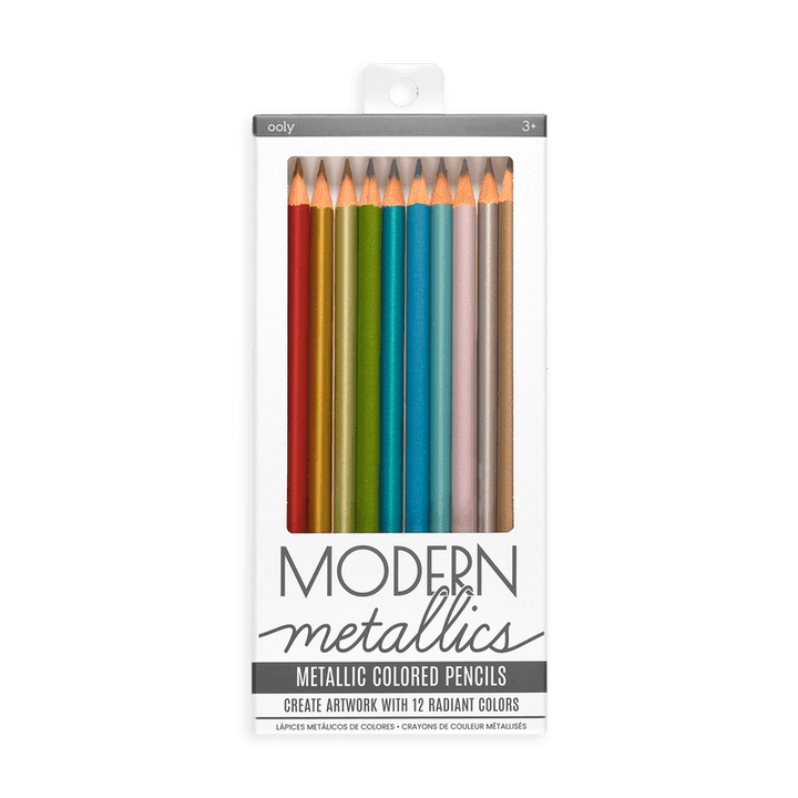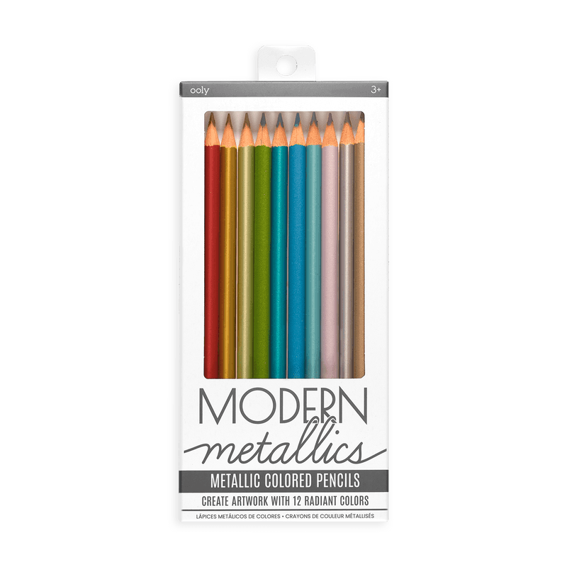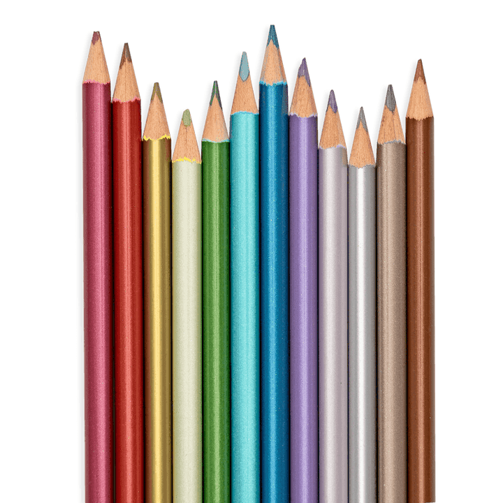 Bring a cool and modern look to your projects with Modern Metallics Colored Pencils. This set features 12 unique colors that'll leave a glistening sheen that can make your coloring truly distinct. Try mixing metallic colors together for even more interesting hues. You can also make elements in your coloring books stand out by mixing metallic colors with classic ones. Modern Metallics have triangular shaped barrels that make a great ergonomic fit for easy coloring; and roll-away pencils will be a thing of the past.