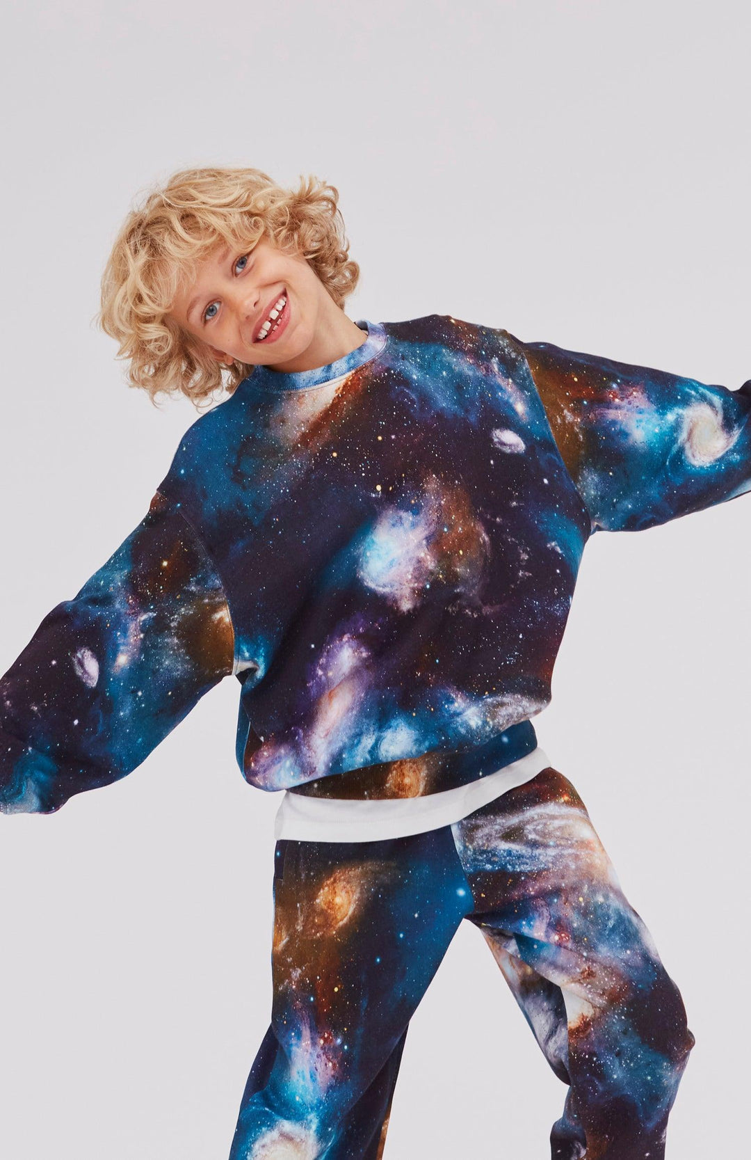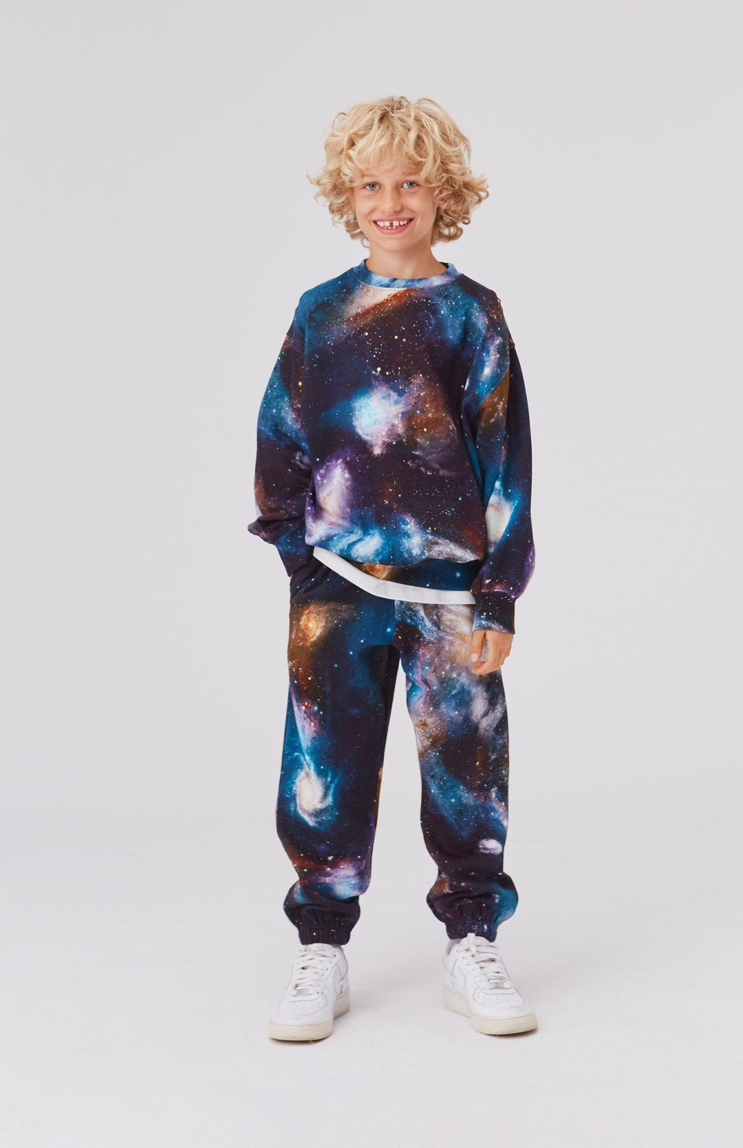 Monti is a unisex sweatshirt with a print of the galaxy. Wear the sweatshirt with matching trousers.