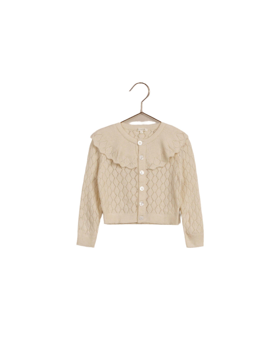 This classic pointelle knit sweater was crafted to hit at the waist and can be layered over any dress. Its oversized knit collar and embellished buttons will have your little one warm and stylish.