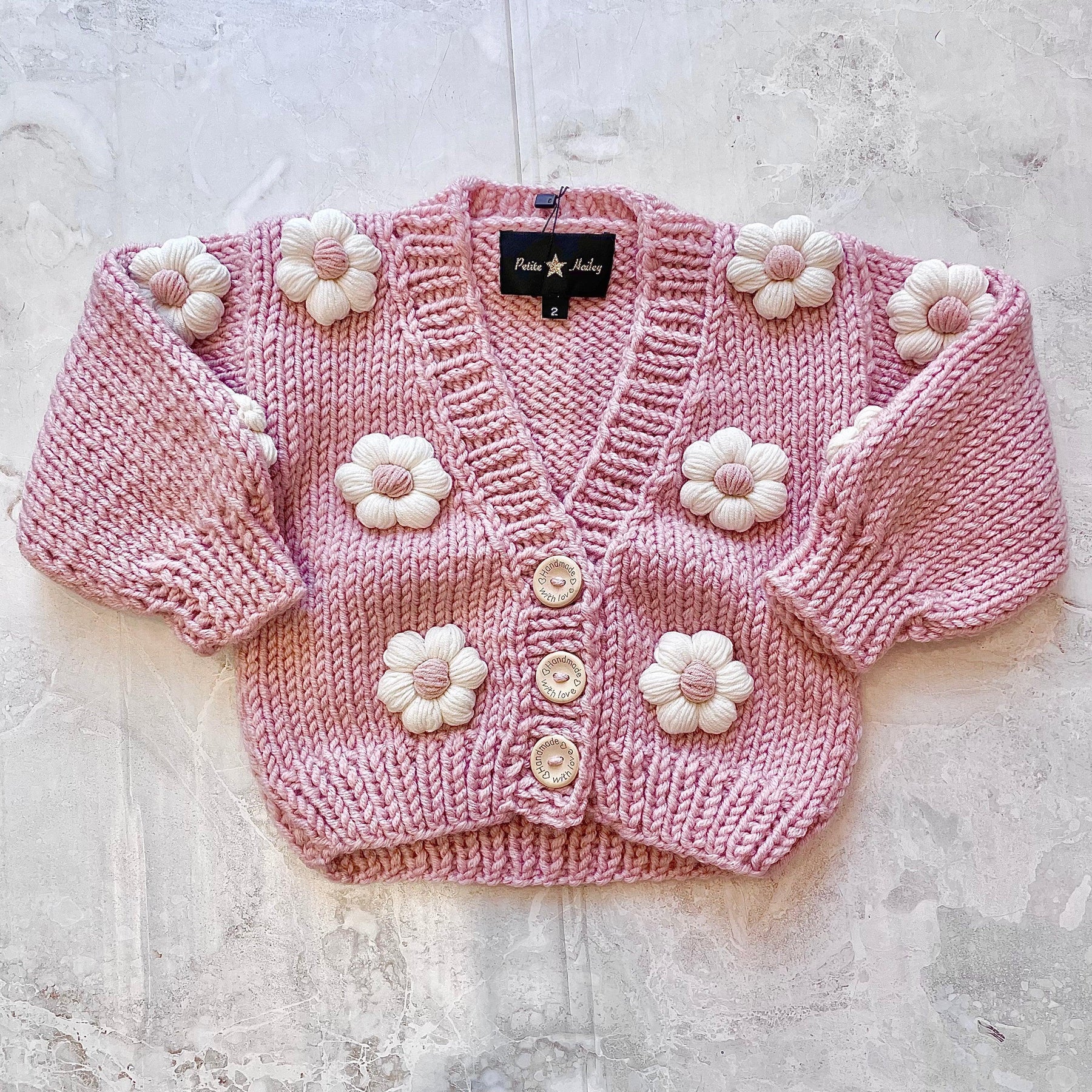 This cardigan is such a vibe-- The sweater is chunky weight, adorable 3-dimensional daisies all over and the look and feel of an oversized jacket/no closure cardigan. This is a piece you will be so happy your Little has in her closet this season.Ā