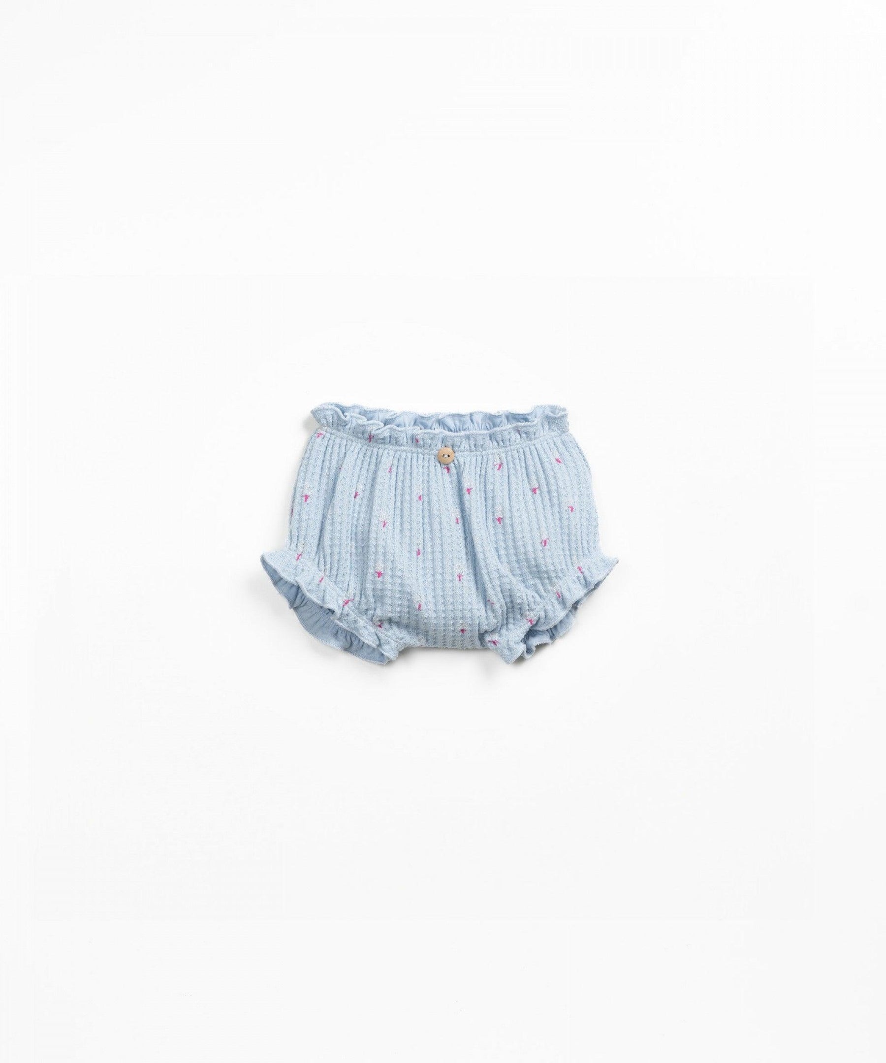This baby girl set is made of jersey with a blend of recycled polyester, recycled cotton, and elastane, in Rain color. The model features a small floral pattern, frills on the upper and lower parts, and a coconut button in the front.