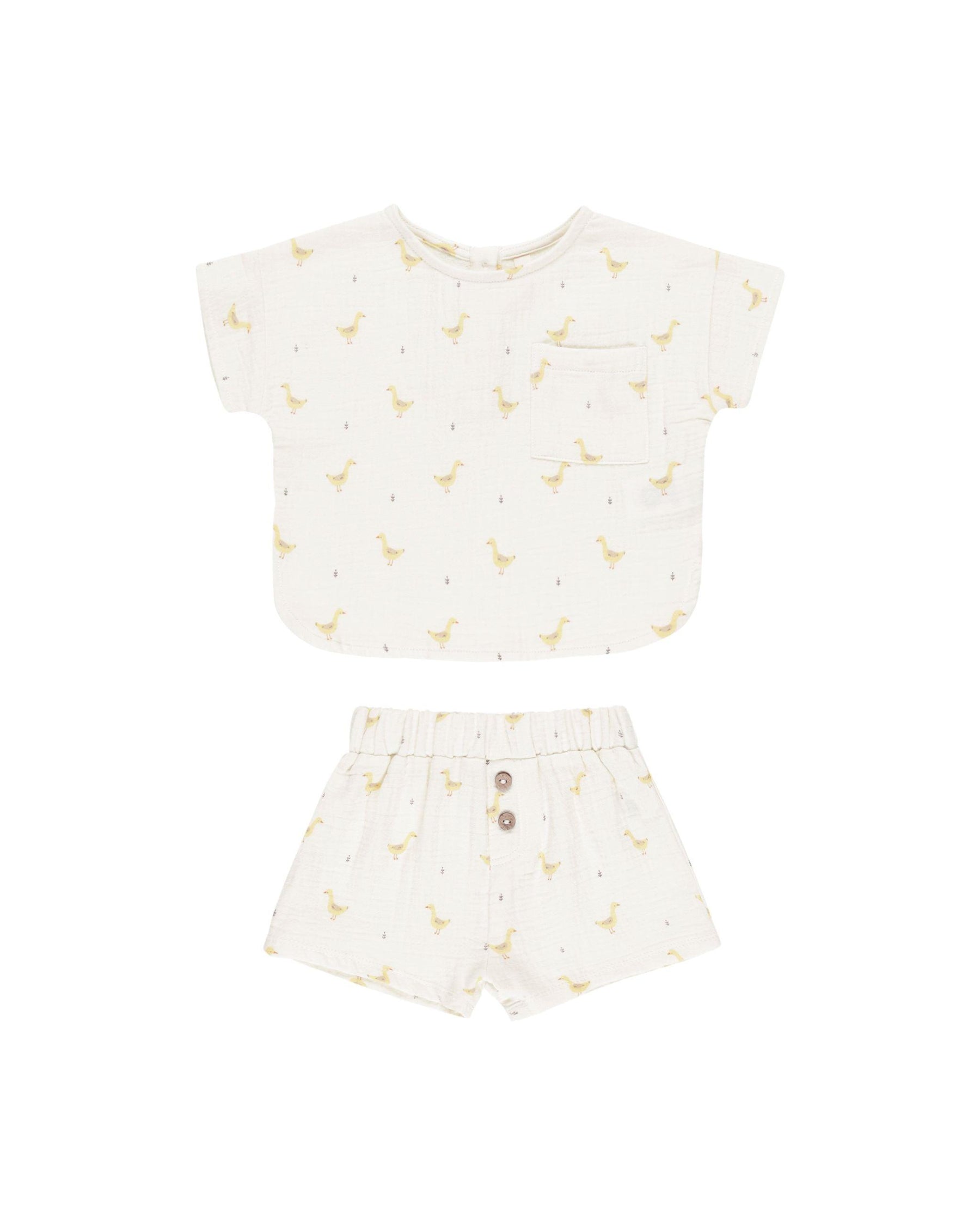Woven set with a boxy tee and matching shorts makes for an easy go-to look for the season!  Featuring coconut button detail at the back neck, and front short.