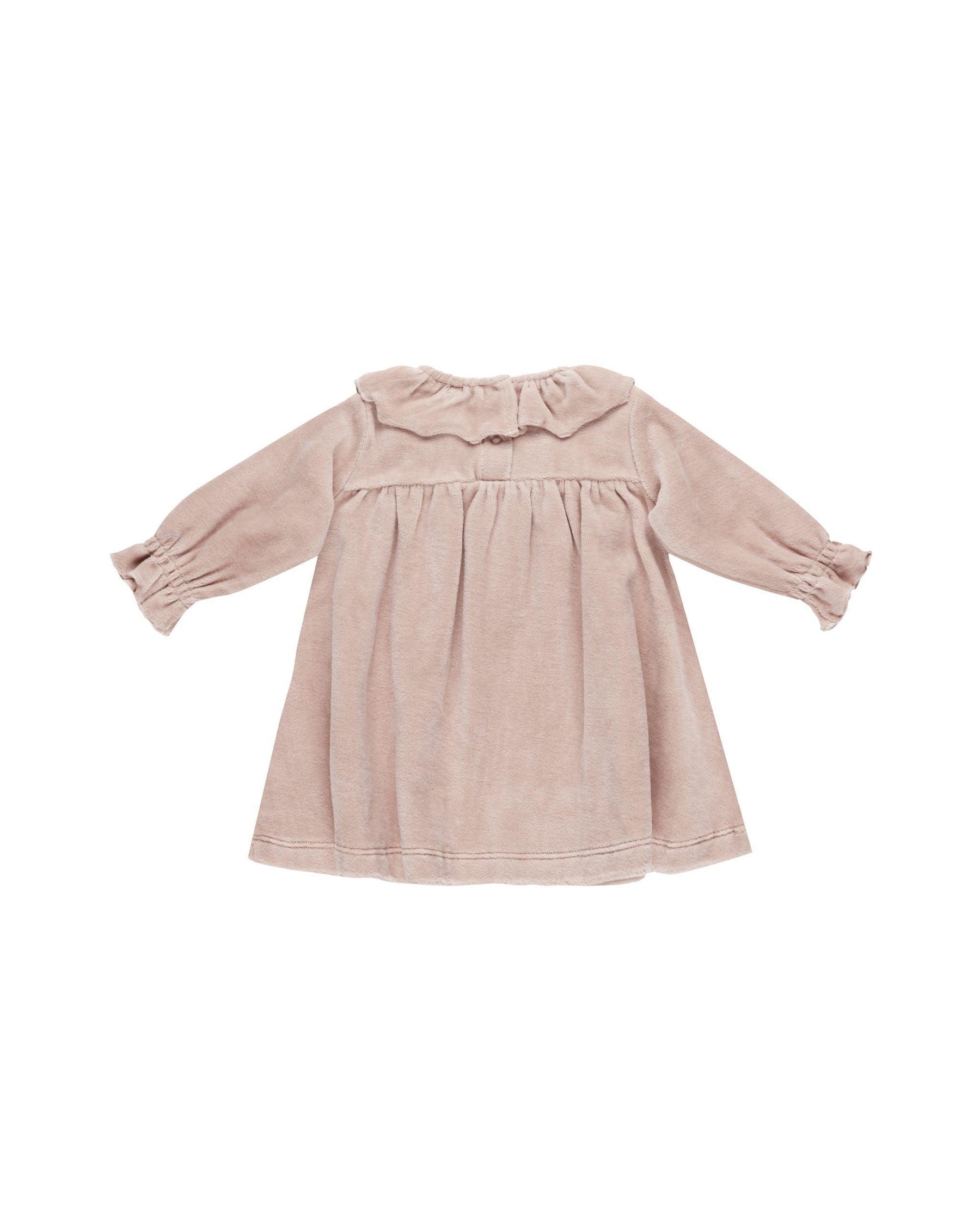 Our Velour Baby Dress features an empire waist dress with long sleeves and a cute ruffled collar.