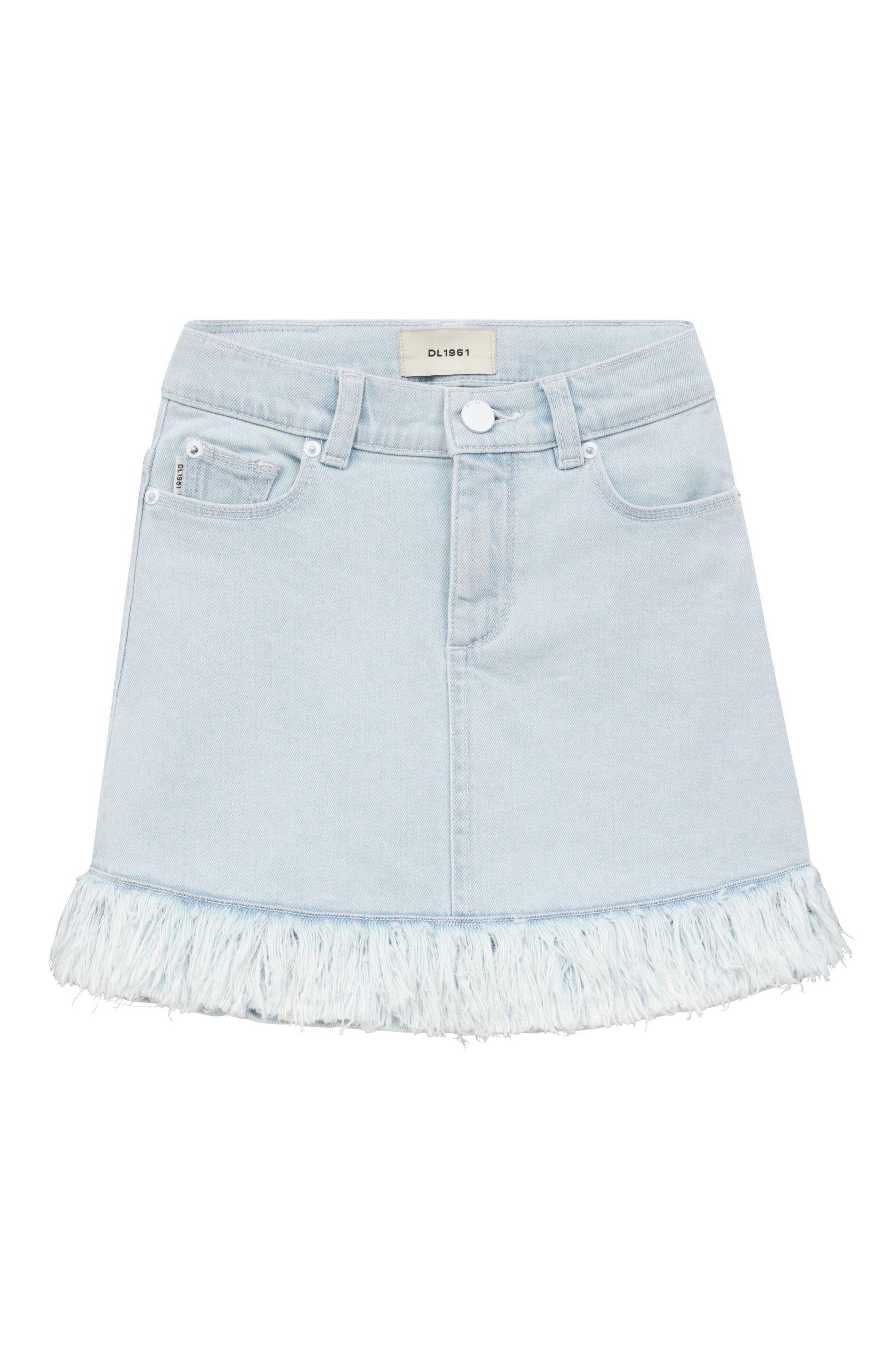 Introducing Jenny, the classic jean skirt by DL1961. With a versatile length and chic silhouette, she's a must-have for any wardrobe. Jenny comes in Denim Fur, a unique faded blue wash with a playful frayed denim fringe at the bottom.
