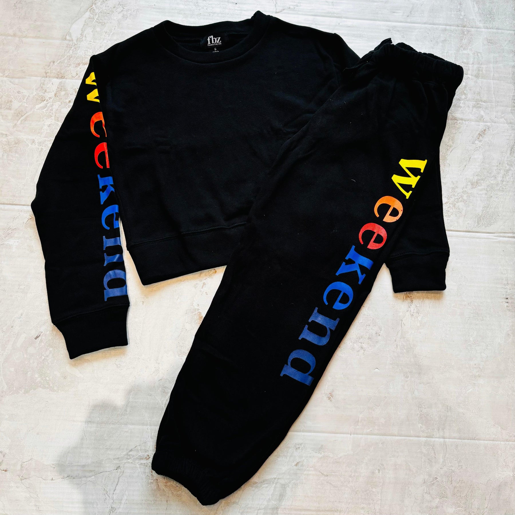 Get ready to lounge in style with our Tween Set in this Black Weekend Sweatsuit Set from Flowers by Zoe! Made from a comfortable blend of 90% cotton and 10% spandex, this set features a playful weekend graphic on the sleeve of the sweatshirt and leg of the sweatpants. Hand wash in cold water and line dry for easy maintenance.